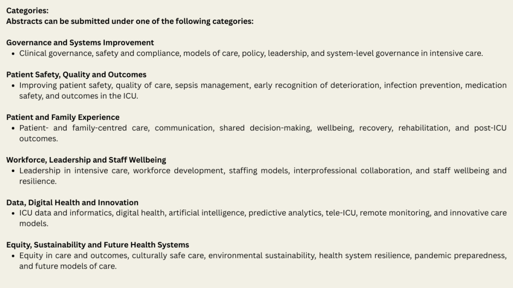 Please read the guidelines below carefully. Abstracts not submitted in this format may not be considered for review. If you have any difficulties or queries about the abstract format, please contact the following email anzics@anzics.org